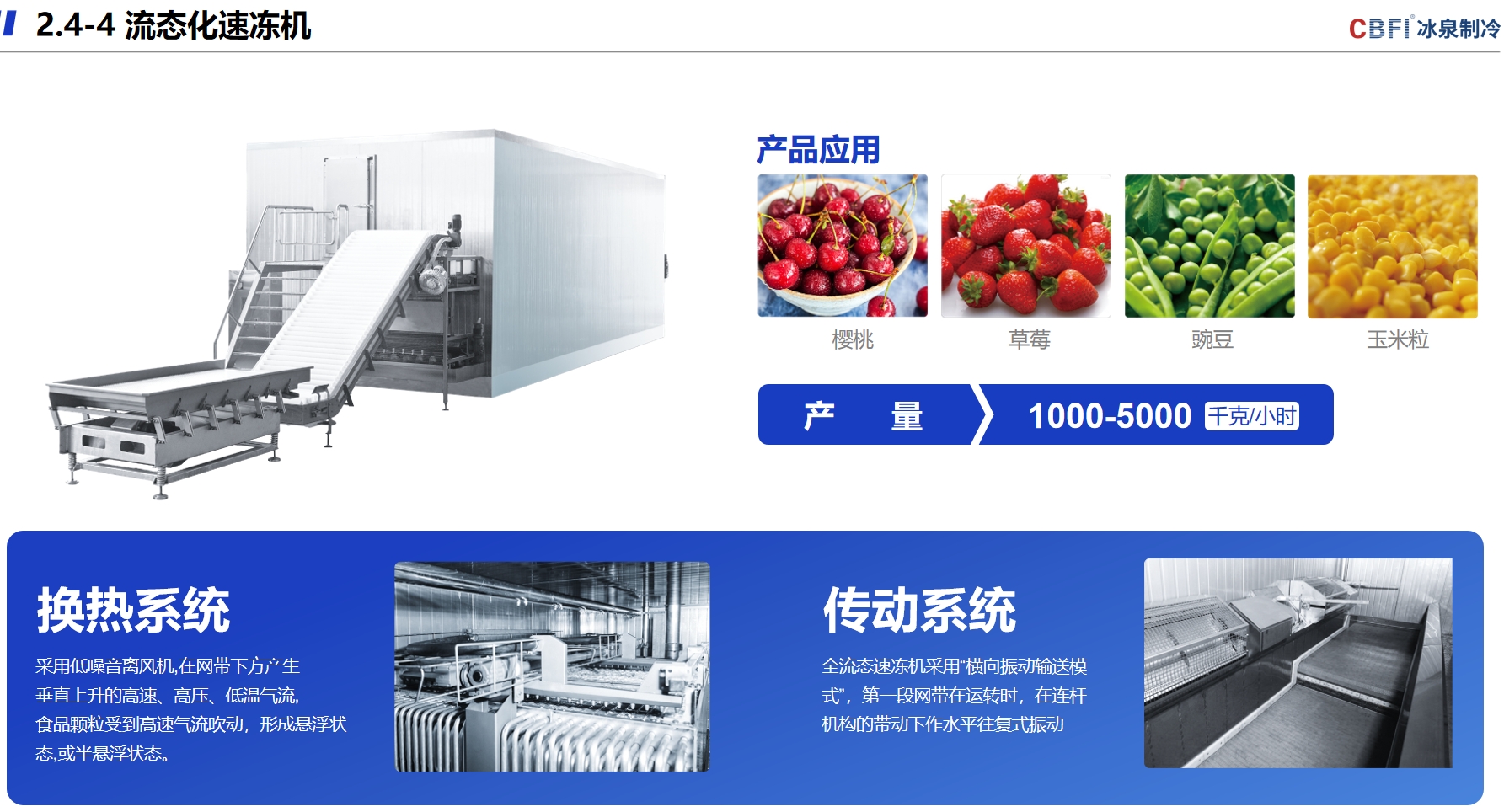 CBFI冰泉流態(tài)化速凍機(jī),產(chǎn)量1000~5000千克/小時,主要適用于蔬菜水果等顆粒狀、片狀、塊狀、丁狀食品的單體凍結(jié)。