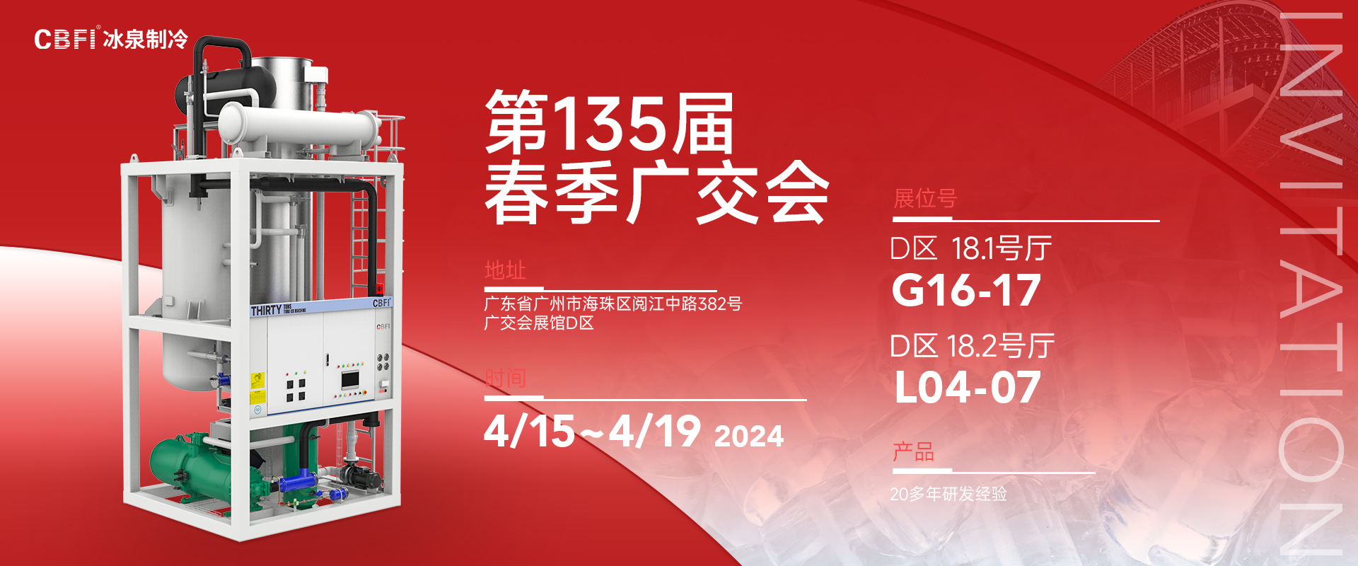 2023年10月15日-19日,第134屆秋季廣交會第一期成功舉辦。冰泉制冷作為連續(xù)多年參加廣交會的企業(yè)之一,本次展會攜螺旋速凍設備、管冰設備等產(chǎn)品參展,為客戶提供更加高效高品質(zhì)的成套制冰系統(tǒng)/速凍系統(tǒng)商用解決方案。