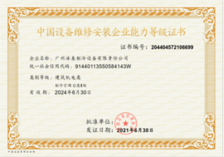 冰泉制冷又順利獲得了由中國(guó)設(shè)備管理協(xié)會(huì)聯(lián)合相關(guān)行業(yè)協(xié)會(huì)頒發(fā)的中國(guó)設(shè)備維修安裝企業(yè)能力等級(jí)證書(shū)(建筑機(jī)電類(lèi))。
