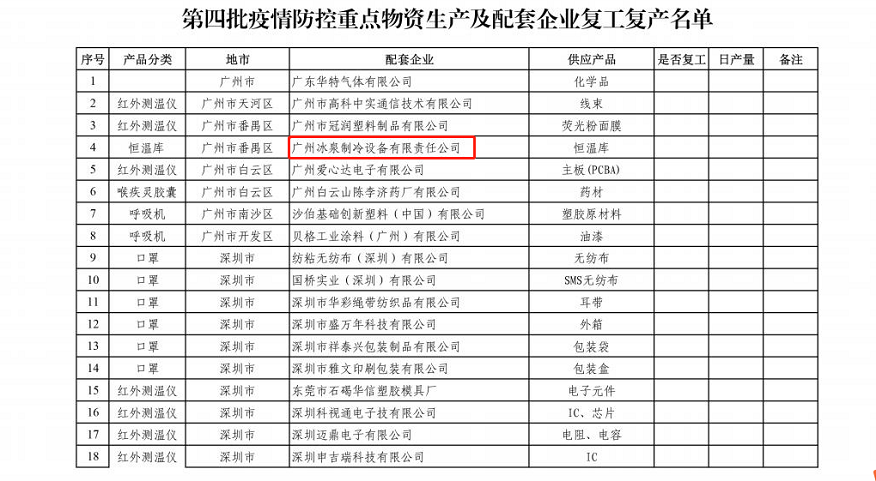 為保障疫情防控重點(diǎn)物質(zhì)生產(chǎn)供應(yīng),廣州冰泉制冷設(shè)備有限責(zé)任公司作為恒溫庫供應(yīng)企業(yè),響應(yīng)政府號召,作為政府第四批疫情防控重點(diǎn)物質(zhì)生產(chǎn)及配套企業(yè)。