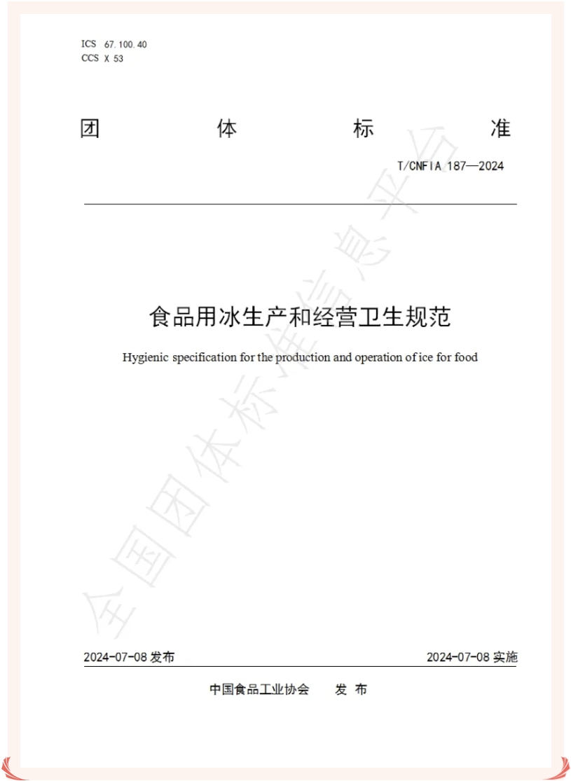 近日,由中國食品工業(yè)協(xié)會發(fā)布了《食品用冰生產(chǎn)和經(jīng)營衛(wèi)生規(guī)范》(T/CNFIA187-2024,冰泉制冷有幸作為標(biāo)準(zhǔn)起草單位之一,參與該項標(biāo)準(zhǔn)的起草編制。